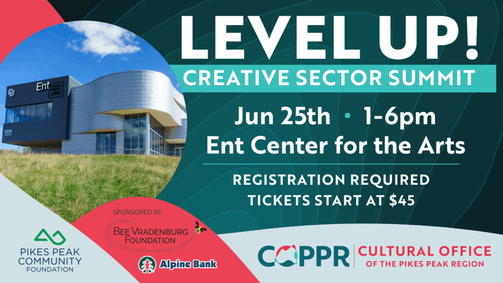 Join the Cultural Office for the Pikes Peak region’s first professional summit at the intersection of business and creativity. The Level Up! Creative Sector Summit will be held June 25, 2025 from 1:00-6:00 p.m. at the Ent Center for the Arts at UCCS.