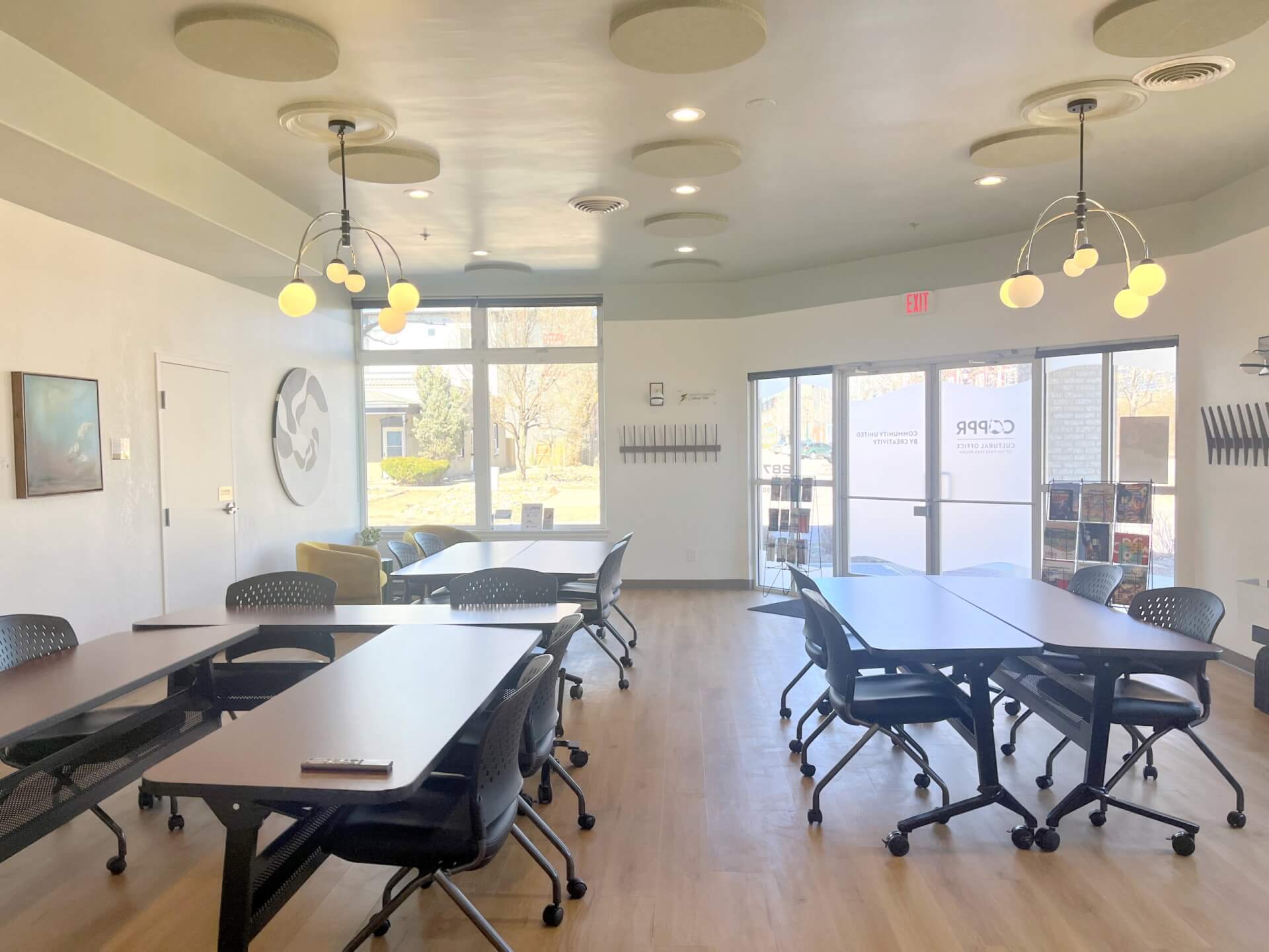 The large double doors facing the intersection open right into the Tiemens Foundation Cultural Hub. This large community room and restrooms in the hallway are ADA accessible. The wall of windows on the East side looks into a charming neighborhood park, which offers an adjacent outdoor setting for activities.ย